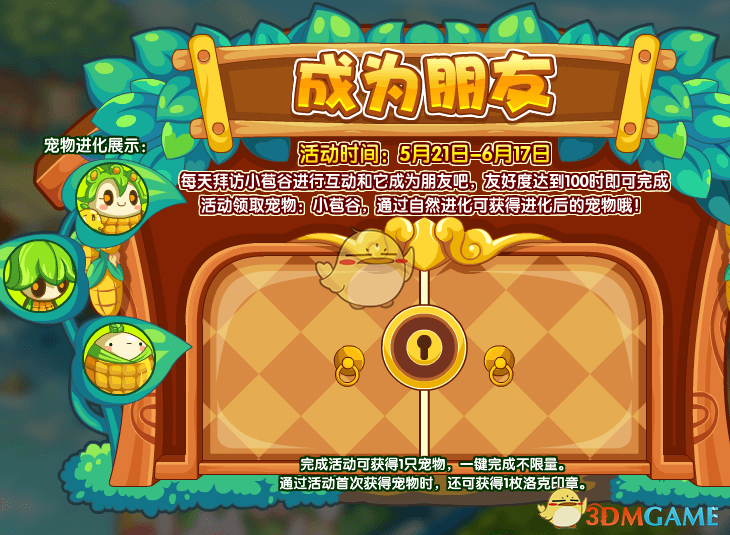 每天拜访小苞谷进行互动和它成为朋友吧,友好度达到100时即可完成活动领取宠物:小苞谷(通过自然进化还可获得后续宠物)