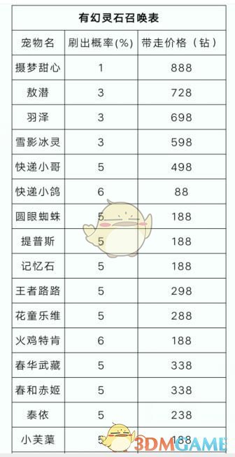 下面是有幻灵石召唤宠物,召唤内容及概率,以及对应洛克钻消耗: