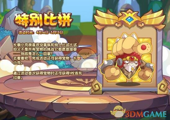 参加4月16日-5月13日的【特别比拼】活动,完成活动还可获得宠物:长拳小克。