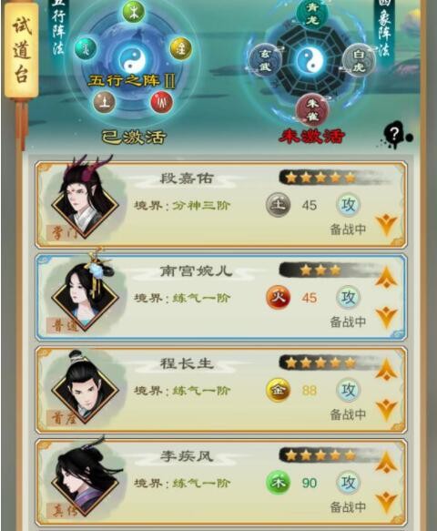 根据上阵弟子的五行属相能够形成不同的阵法,其中门槛最低也是大家初期最好组的就是五行之阵了,不过相应的提升也比较有限,随着弟子的增多后续也会根据使用场景替换。