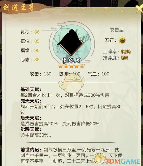 前世传记:剑气纵横三万里,一剑光寒十九洲,仗剑当空干里去,—史别我二史回。一剑起,天下便再无不平事,一剑落,三十三天上仙人脆。