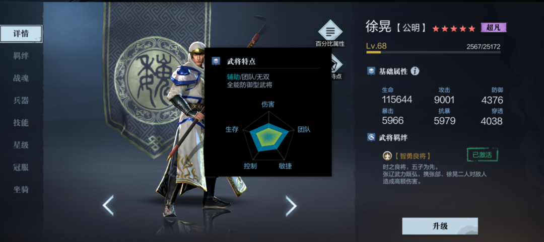 武将特点辅助、团队、无双,全能防御型武将。