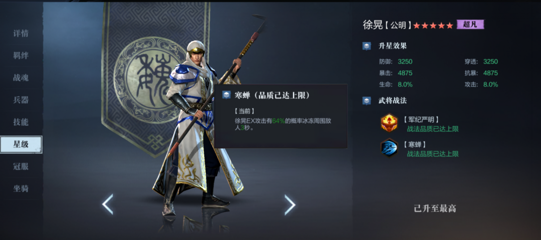 【寒蝉】:徐晃EX攻击将有概率冰冻周围敌人3秒,概率随星级提升而增加。