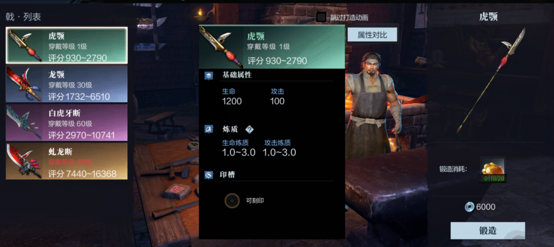 戟(虎颚、龙颚、白虎牙断、虬龙断),穿戴等级分别为1级、30级、60级、90级。