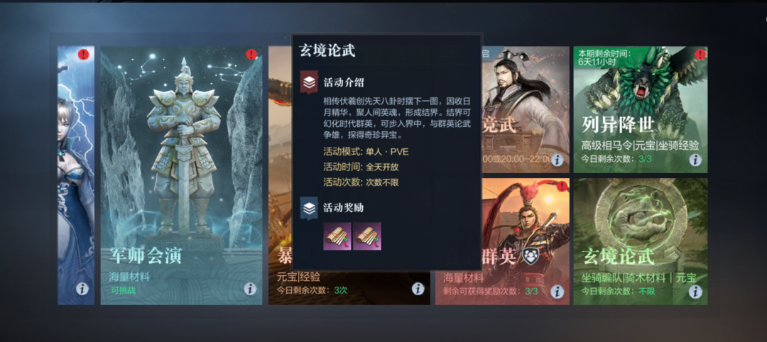 “玄境论武”属于偏后期的单人PVE挑战玩法,主公角色到达70级即可解锁。小霸王们将以闯关的形式进行挑战,目前共有十个章节,每章又分二十个小关卡,在规定的时间内达成过关条件即可。