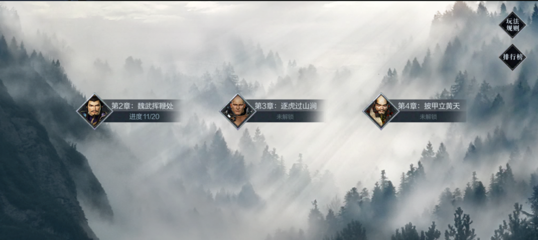 每个章节都有各自的主题,主题内容概括了该章节的背景剧情,以及明确关底BOSS,如第一章“擅权乱天常”就是以讨伐董卓为背景的副本挑战。