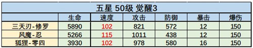 上图给了一个每个抽到修罗的人都能出来的队伍做例子(零四和忍都是初始抽卡必出的)剩下的位置再补一个奶妈,奶妈因为速度都没超过100,就不单独拿上来了。所有角色的速度都是固定的。