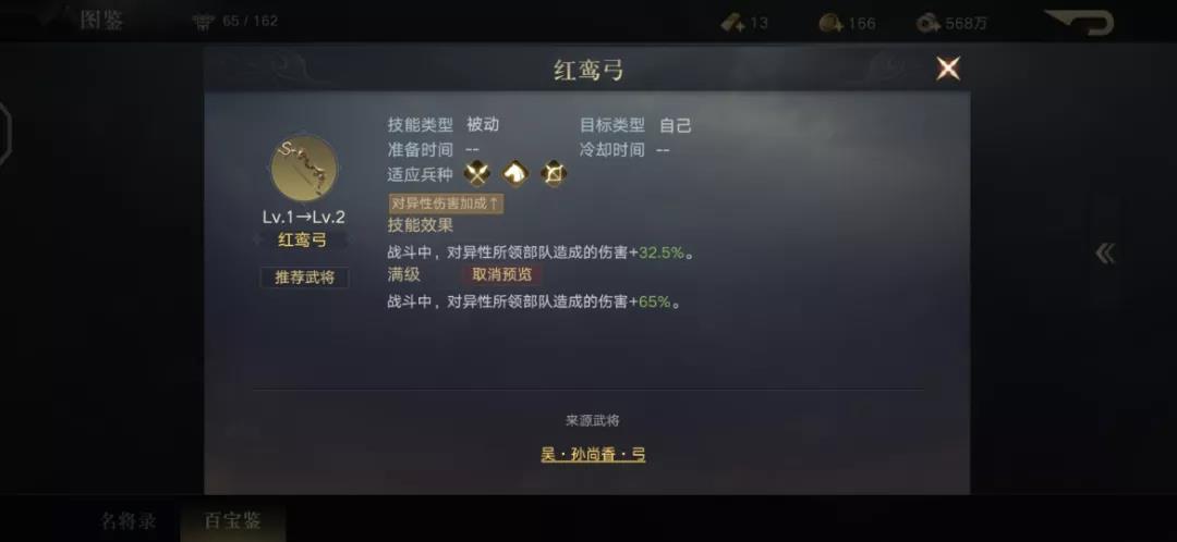 但如果对方的阵容全是刘备、赵云等男性武将,想要最大输出,红鸾弓就是很不错的选择,满级高达65%的伤害加成,配合后输出能力提升还是十分可观的。