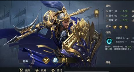 一般情况下推荐给曹仁配备虎卫兵符,受到普攻几率回复兵力外,后续的伤害加成以及伤害减免也还是比较可观的。