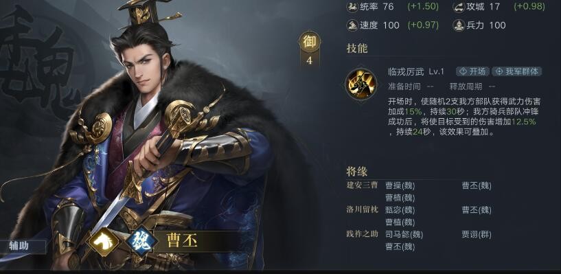 开场时,使随机2支我方部队获得武力伤害加成15%,持续30秒;我方骑兵部队冲锋成功后,将使目标受到的伤害增加12.5%持续24秒,该效果可叠加。