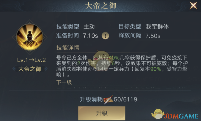 由于孙权谥号为吴大帝,在设计技能的时候,大家都一致同意,技能要和孙权的谥号相关,而在三皇(三皇分别是汉昭烈帝刘备,魏武帝曹操,吴大帝孙权)中,孙权最擅长的便是御下。最终,在多方讨论后,命名为:大帝之御。大帝当然是指的吴大帝孙权了,而御既可以表现孙权的御下能力,也能说明该技能以防御为主。