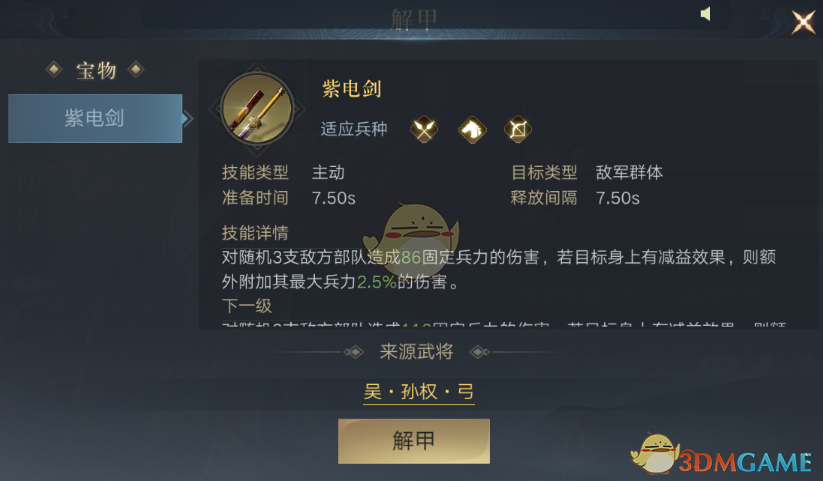 说到孙权的武器,大家一定会想到孙权所收藏的六柄名剑。在马缟《中华古今注》卷上:吴大帝有宝剑六:一曰“白虹”,二曰“紫电”,三曰“辟邪”,四曰“流星”,五曰“青冥”,六曰“百里”。而在这六柄名剑中,又以紫电最为出名。在王勃的《滕王阁序》中写到“紫电青霜,王将军之武库”。古人对紫电的描述如下:此剑紫芒如电,精芒夺目,宝雾腾辉,冷气侵人,约莫三尺来长,剑柄之上,镌有古篆“紫电”二字。正是如此,在设计孙权的宝物的时候,策划就想到了紫电剑。