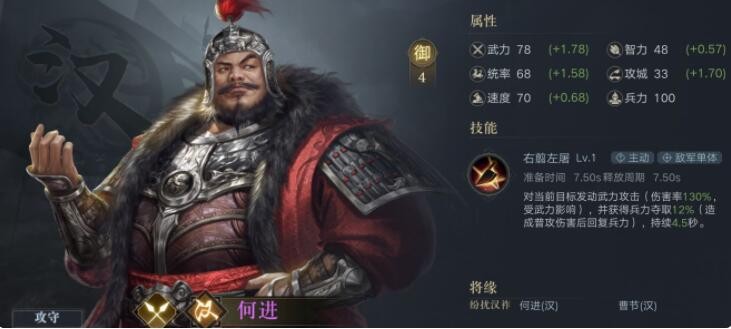 紫将方面,我推荐曹洪,出色的援护能力和统率回复能力,可以很好的替代何进,肉盾的属性更强。