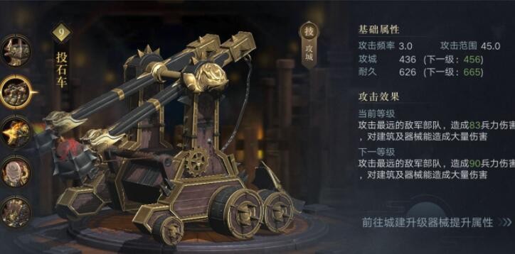 在游戏中,不管是基础还是成长上,投石车的攻城值都是最高的。