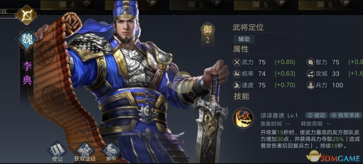 荣耀新三国手游李典怎么样?这是一个很受欢迎的英雄,很多小伙伴想要知道他厉不厉害,值得培养吗?下面是小编给大家带来的《荣耀新三国》手游李典技能属性立绘图鉴分享,一起看看吧!