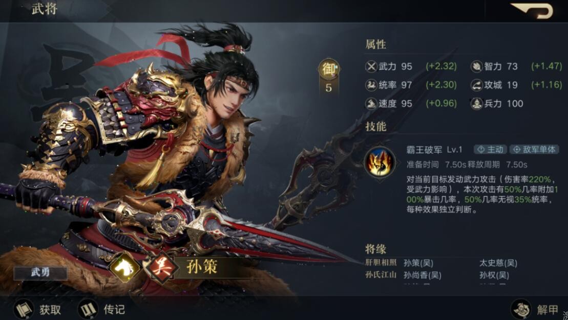 甘宁与孙策都是很强力的武勇型输出武将,而吕蒙自身攻守兼备,再加上大乔的辅助,让队伍的容错率变的更高。不过孙策的获取难度比较高,在没有到手之前可以由孙坚或是韩当替补。