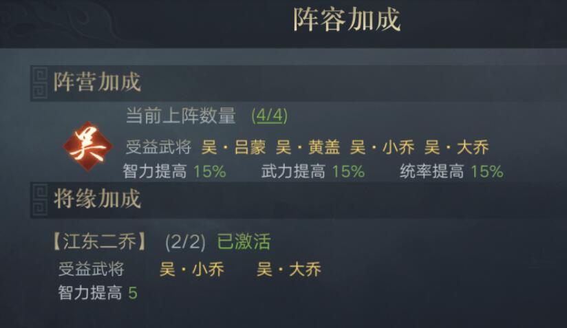 这套阵容主要是激活了江表虎臣这个羁绊,对全体武将的加成不少,还有同为吴国势力的加成。在队伍中甘宁依靠强大的主动技负责主力输出,黄盖的技能苦肉之计同样拥有不俗的输出能力。