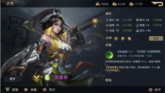 3、后期阵容的搭配上,这里推荐主C-关羽、副C-张飞、辅助-刘备&陈到(20御)。实际上,该套阵容为骑兵杀手队,团体兼顾有伤害减免、克制骑兵职业、盾甲等特点。但缺点是遭遇弓兵系阵容时比较吃亏。