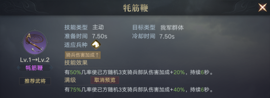 能够给到三支骑兵队伍6秒的伤害加成,在四骑的队伍里正好合适,每个武将都可以担任队伍的输出。