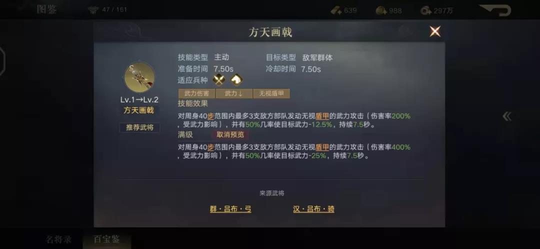 方天画戟无视盾甲的群体攻击非常实用。同时也有个问题,它对单个武将的输出比较有限,即使400%的伤害已经不低,但遇到拥有高额减伤的枪兵阵容,方天画戟就显得比较鸡肋。