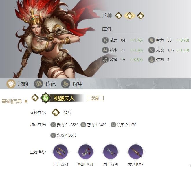 荣耀新三国游戏中祝融夫人加点推荐武力优先,具体加点推荐:武力 91.35%;智力 1.64%;统率 2.16%;先攻 4.85%。宝物推荐:日月双刀、柳叶飞刀、国士双剑、丈八长标。