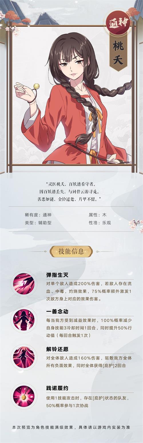 “灵医桃夭,百妖谱看守者。因百妖谱丢失,与同伴云游寻觅。善恶如谜,金铃过处,片甲不留。”