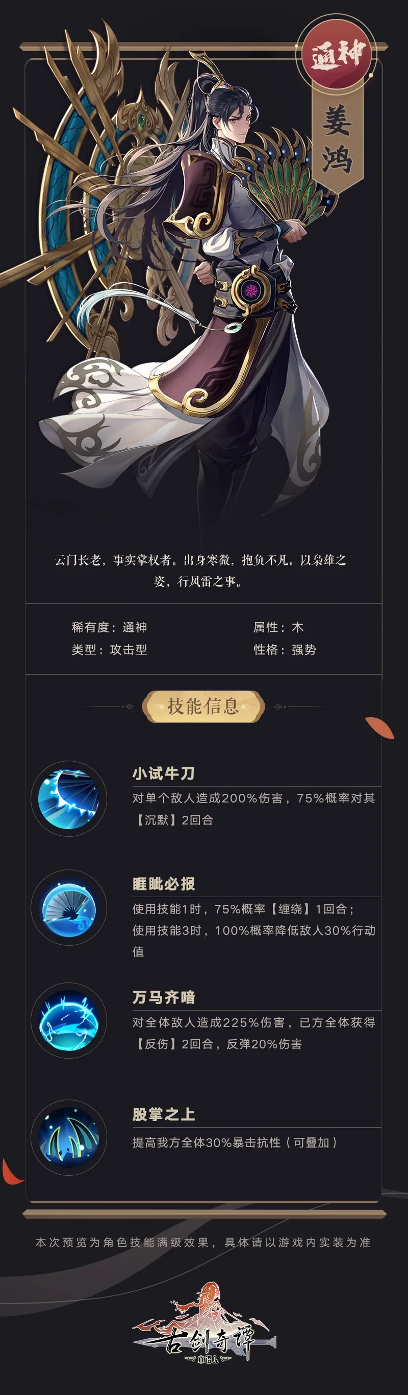 姜鸿信息及技能如下所示: