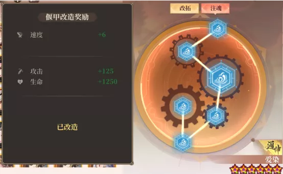偃甲需要先完成基础的6级改造,并且偃甲自身等级达到60级,才可以进行注魂改造。偃甲进行注魂改造后可以大幅地提升其基础属性,并且被注魂改造后的偃甲星级也会有特殊的显示。