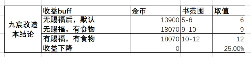首先这里要先说一下全副本加成开启,目前打改造有基础材料,还有一个加成,加成固定是100%。目前赐福期是全部副本都开放,所以我们一般打出来是9个紫书+加成9个紫书,赐福去掉以后,根据看以前内测的攻略,可能是按天数开启,比如1/3 开火改造的加成,2/4开阴阳,所以对最后的效率没啥影响,赐福没了以后可能要按时间进行