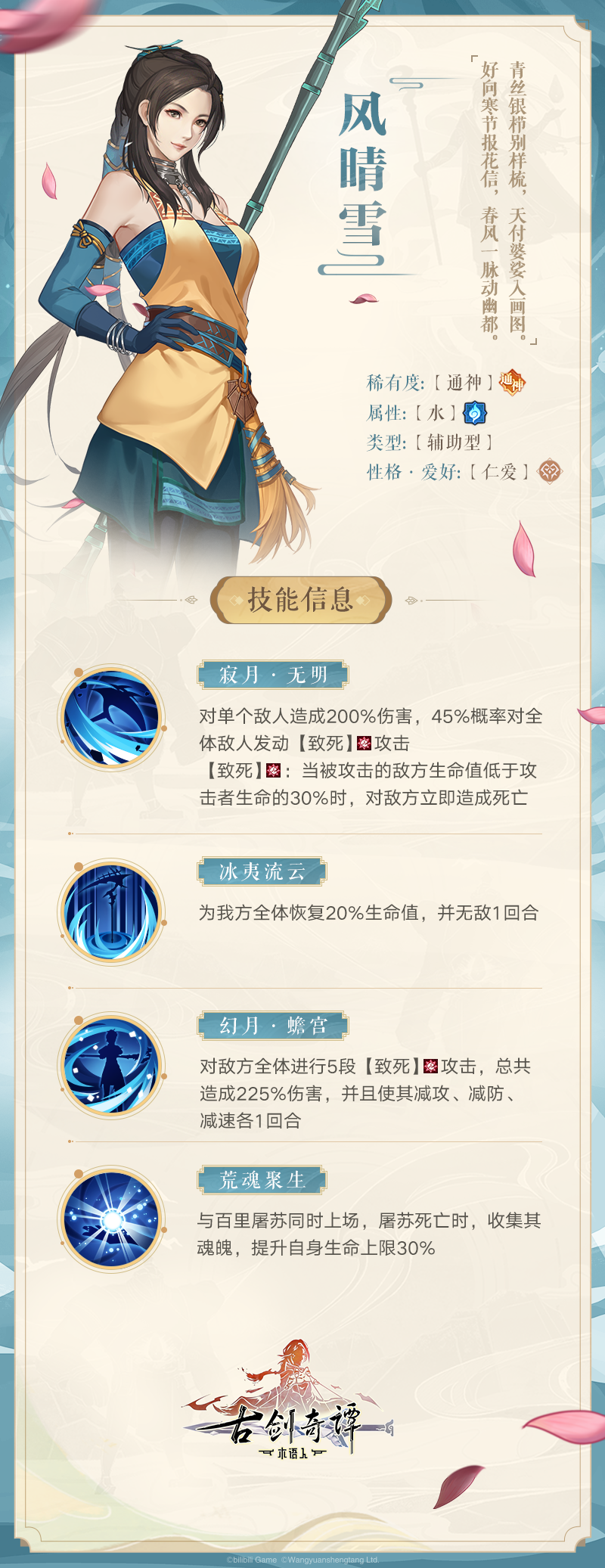 简单来说,风晴雪品质达到了通神级,为水属性的辅助类角色,其个体兼顾有生命值回复、降低敌方的各种属性,且拥有不错的输出强度