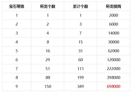 以下银两消耗仅计算每个宝石的最初价格2000银子/个
