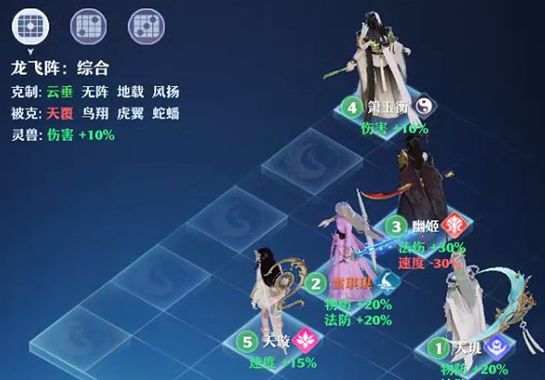 超低速青云的最爱,如果你的队伍里有青云大佬(高阶陆雪琪或者你就是),不用考虑了直接龙飞走起!3号输出C位法伤+30%,速度-30%;1号和2号位双防+20%;5号速度+15%,4号及灵兽位伤害+10%!