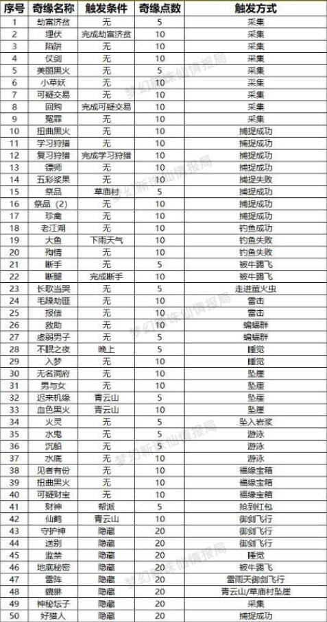 目前能够拉开人物等级差距的,除了卡世界等级以外,就主要靠奇缘任务了,游戏中一共有百业、仙途、妙趣、隐藏共四种奇缘,其中百业21个,仙途26个,妙趣22个,隐藏数量未知。