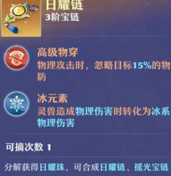 这是一条三阶的[高级物穿+低级冰元素]的灵兽宝链,低级元素攻击和高级元素攻击的差别为是否能够附加对应的属性状态,也是所有技能中,唯一一个低级和高级技能对输出伤害没有任何区别的技能。
