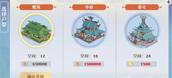 创建山庄有三档户型选择:【雅筑】总共有12个空间,创建花费65万铜钱;【华府】花费150万铜钱,空间18;最高档次的【豪宅】空间24,需要花费1500元宝。简单来说就是两档平民一档氪佬。