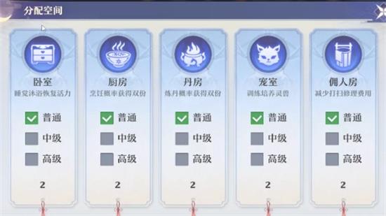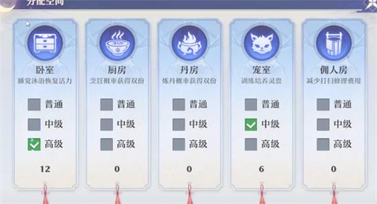 我们以华府为例,每个仙府都将拥有【卧室】、【厨房】、【丹房】、【宠室】和【佣人房】,而选择户型时的空间分配即可以用来选择每个建筑的等级。其中每个建筑的普通级都将消耗2点空间,中级消耗6点,高级消耗12点。