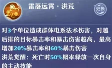 在技能原有的基础上,死亡时50%概率施放一次主动技能,相比其他神兽觉醒效果来说比较鸡肋一些,主要是施放概率没有100%,这看脸的几率最要命了,只要死亡一次没有触发释放就有被放生的危险图片