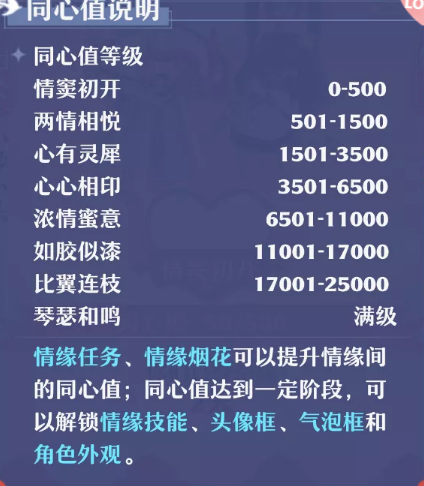 情缘双方获得同心值到达不同阶段,即可解锁同心奖励,获得情缘气泡框、情缘头像、情缘称谓、情缘贴花、情缘角色外观等丰厚奖励,以及各类情缘技能。