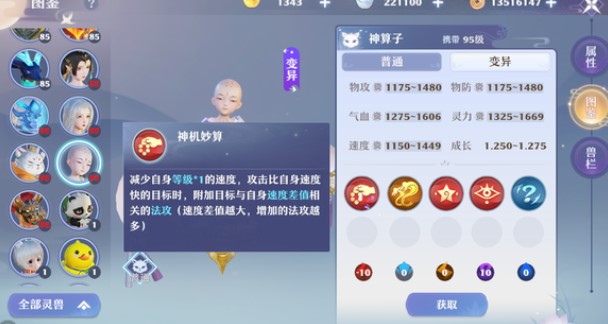 神机妙算 减少自身等级×1的速度 攻击比自身快的目标时 附加目标与自身速度的差值相关的法攻 速度差值越大 增加法功越多