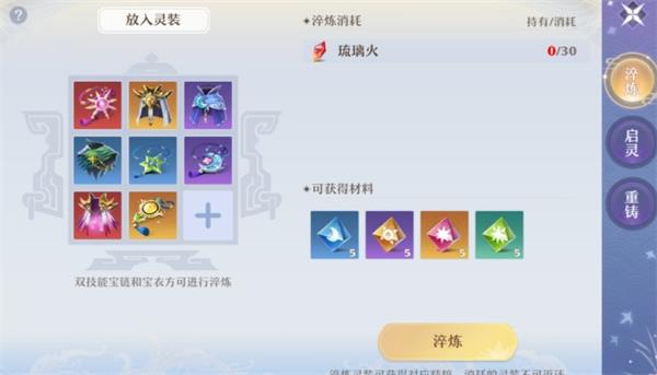 淬炼不同品质的宝衣可获得1个对应品质的启灵材料[精粹],淬炼不同品质的双技能宝链可获得4个对应品质的[精粹](单技能宝链无法进行淬炼),[精粹]可用于对应品质的灵装启灵。