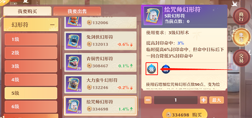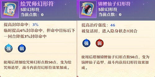 4、五阶幻形符绘咒师和锦鲤仙子,绘咒师适合搭配长生或是合欢使用,可以临时提高封系的命中效果;锦鲤仙子则是南疆和天音的首选,不仅可以提高治疗强度,而且在自身复活后隐身一个回合,大大的提高了辅助门派的生存空间,无论是三输出队还是双奶队,都值得使用。