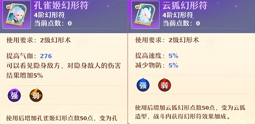 3、除了元素属性的加入,本次幻形符玩法的升级还加入了6张全新的幻形符。四阶幻形符孔雀姬和云狐,其中孔雀姬可以帮助玩家看见隐身单位,并且增加对隐身单位的伤害,可以配合输出职业用来对付隐攻宝宝;云狐则是提高5%的速度,减少5%的物防,可以搭配合欢等高速门派使用,但抢一速的同时需要注意生存空间。