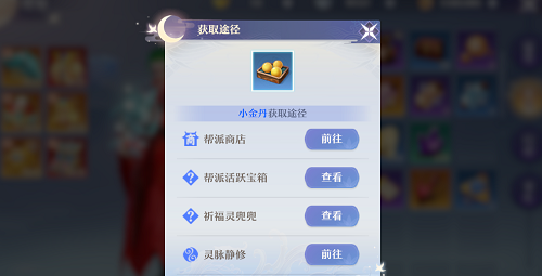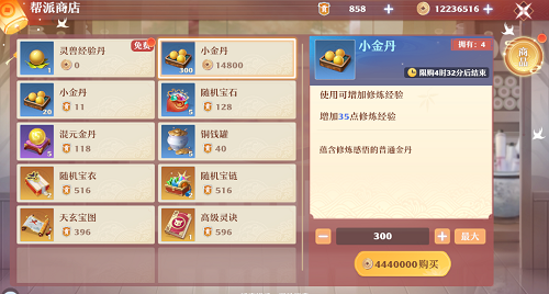 3、不过上面提到的玩法只能够获得少量的小金丹,想要获取到大批量的小金丹,就只能通过帮派商店了,我们通过帮派商店每天可以获取300颗小金丹,就是一万多的修炼经验。购买300颗小金丹需要444万的铜钱,赚铜钱最快的方式是通过生活玩法,而想要玩转生活玩法则需要足够的活力,活力获取途径有三种:镇魔令、门派修行和龙鳞果。