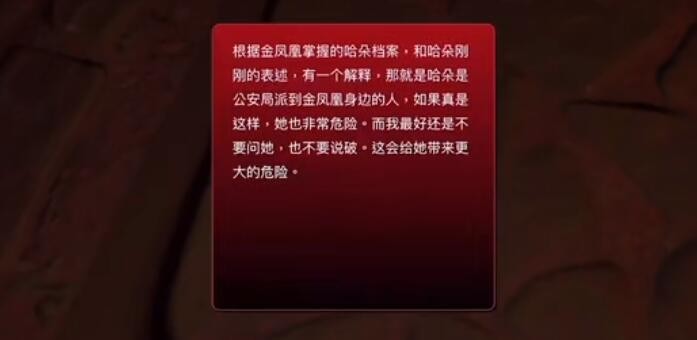 线索详情:根据金凤凰掌握的哈朵档案,和哈朵刚刚的表述,有一个解释,那就是哈朵是公安局派到金凤凰身边的人,如果真是这样,她也非常危险。而我最好还是不要问她,也不要说破。这会给她带来更大的危险。