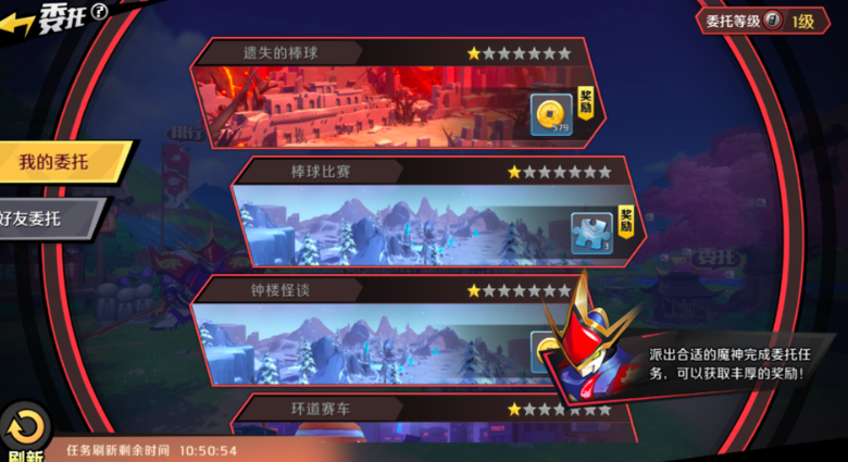 接取委托后,只要按任务要求放置相应神魔即可在一定时间内自动完成,任务对上阵魔神有属性要求,注意高练度、匹配属性的神魔要优先分配给高星任务。