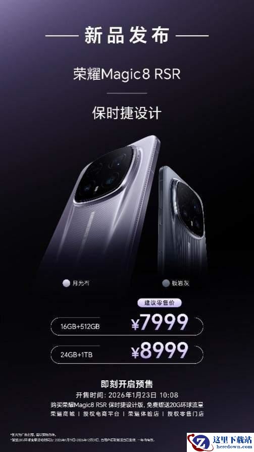 荣耀Magic8 RSR 保时捷设计提供“月光石”与“板岩灰”两种专属配色,推出24GB+1TB、16GB+512GB两种存储版本。新机将于即刻开启预售,并于1月23日10:08分在荣耀商城、各大授权电商及荣耀体验店正式开售,售价为7999元起。购买荣耀Magic8 RSR保时捷设计版,还将获赠20G环球流量,领取激活一年内有效。