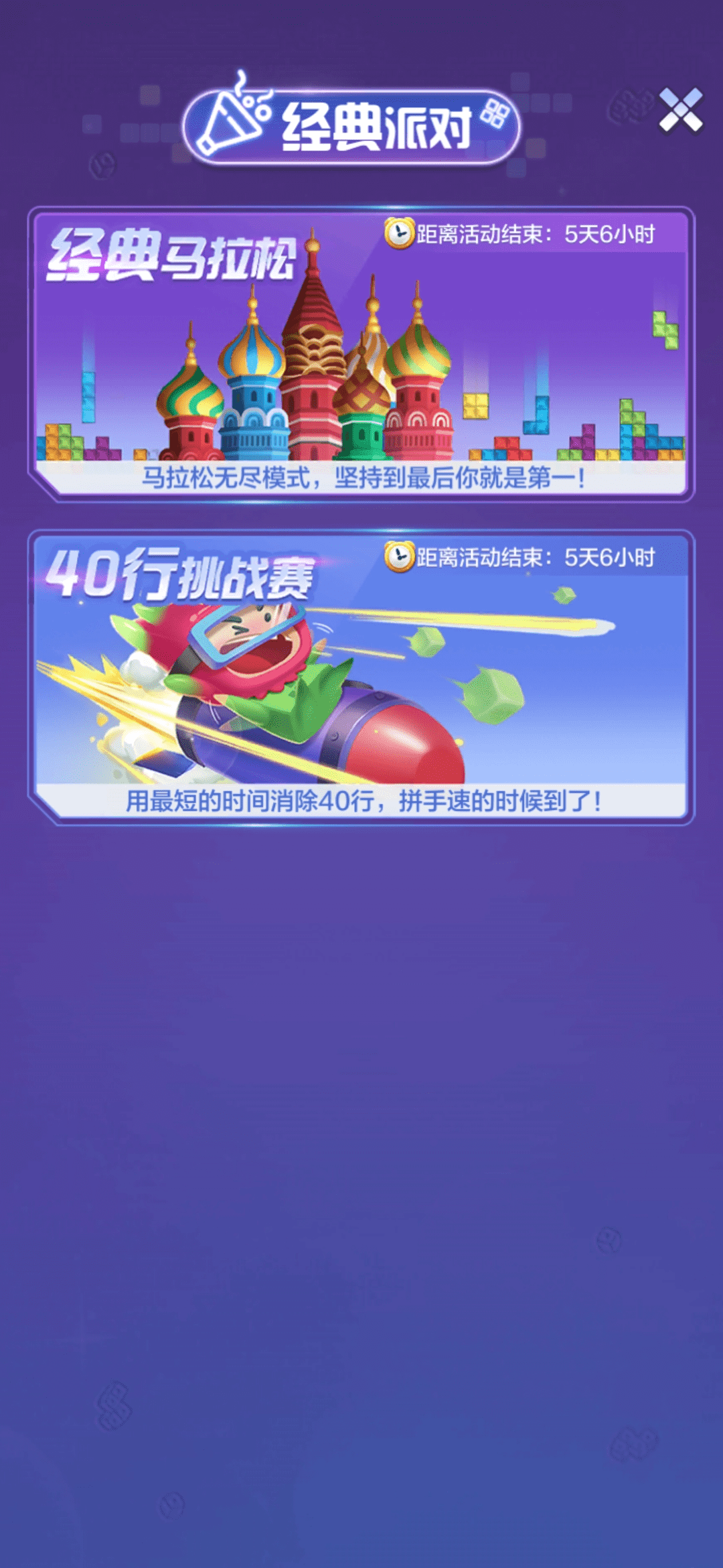 当然,俄罗斯方块的各种经典模式也不能错过!在方块掉落速度越来越快的马拉松模式挑战自己的极限,在最短的时间内完成40行方块消除的挑战,在有限的120秒内完成最多方块的消除吧,方块世界将按照最终行分数排名,上榜全由实力决定!