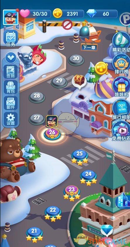 在主界面下方的右侧,有一个城市的按钮,点击进入即可看到点亮城市的界面,在这里可以看到所有关卡,以30一关卡为一章作为一个城市地图,当你在通关的时候,还可以逐渐开放建造建设的奖励,完成全部的建设就可以获得相应的礼包以及相应的城市加成效果。