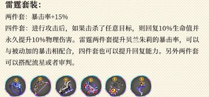 四件套:进行攻击后,如果击杀了任意目标,则回复10%生命值并永久提升10%物理伤害。雷霆两件套提升贝兰朱莉的暴击率,可以与被动加的暴击相配合,四件套也可以提升回复能力。另外两件套可以搭配流星或者审判。