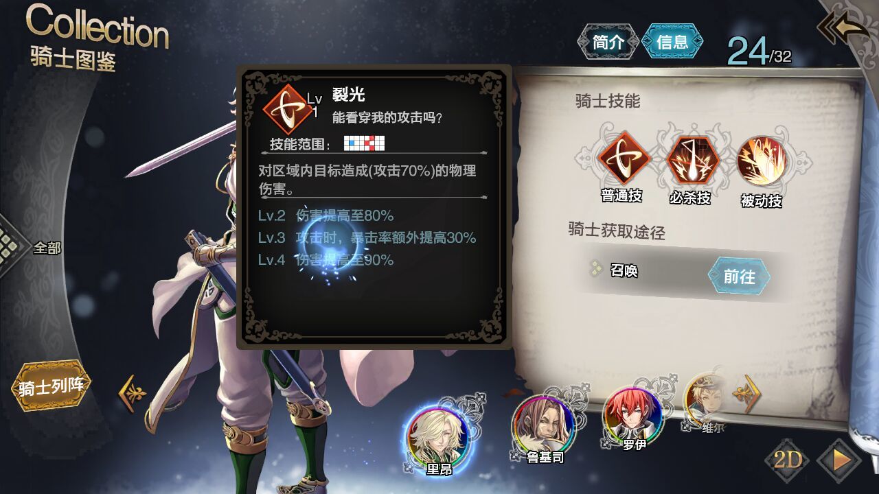 1、斩职业骑士ssr,输出也极其高,一般开局别先用他,先让其他骑士输出,在让他收场。普通技,攻击范围也是三角形不过这次是倒的,区域目标造成攻击70%的物流伤害,注意残血!这样可以打的更多。
